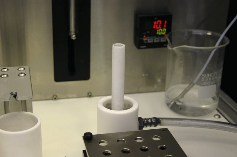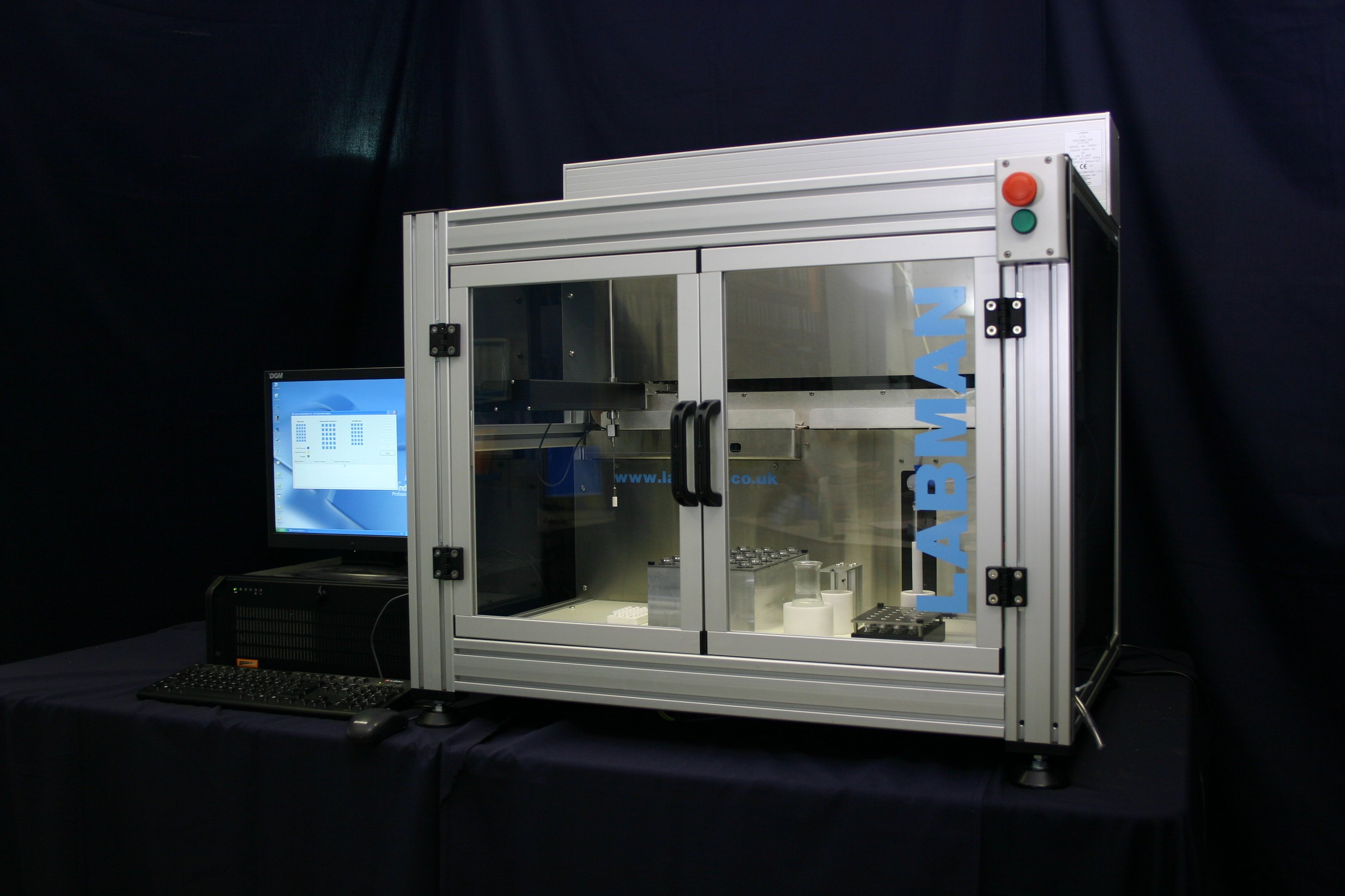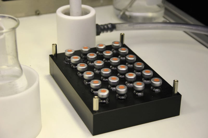 This system takes aliquots from a temperature controlled reaction block via a frit filter and injects them into septum sealed GC vials. The reaction block is peltier chilled and electrically heated allowing for a range of temperatures or computer controlled reaction temperature profiles. The sub-sample is aspirated with the Tecan robot and bespoke needle which loads automatically with a PTFE porous frit. The liquid handling needs to be slow and methodical to prevent the frit blocking and to get accurate liquid dispensing. The aliquots are injected into septum sealed GC vials with the non-coring needle. The materials are all PTFE and stainless steel to minimise corrosion.