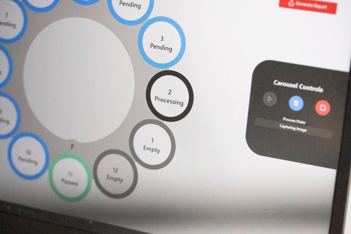 The carousel stacks are illuminated using RGB LED ring lights to allow quick visual status updates.