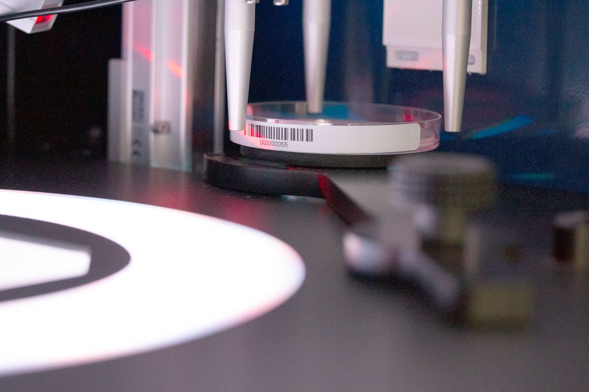 Developed in partnership with Synbiosis, it utilises a carousel that holds one hundred 90mm petri dishes. It de-lids plates from the carousel stacks, reads their barcode, takes an image of the dish’s contents. Then it reunites the bottom half of the dish with its lid and places it back into the carousel.