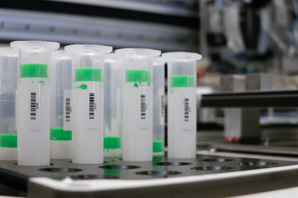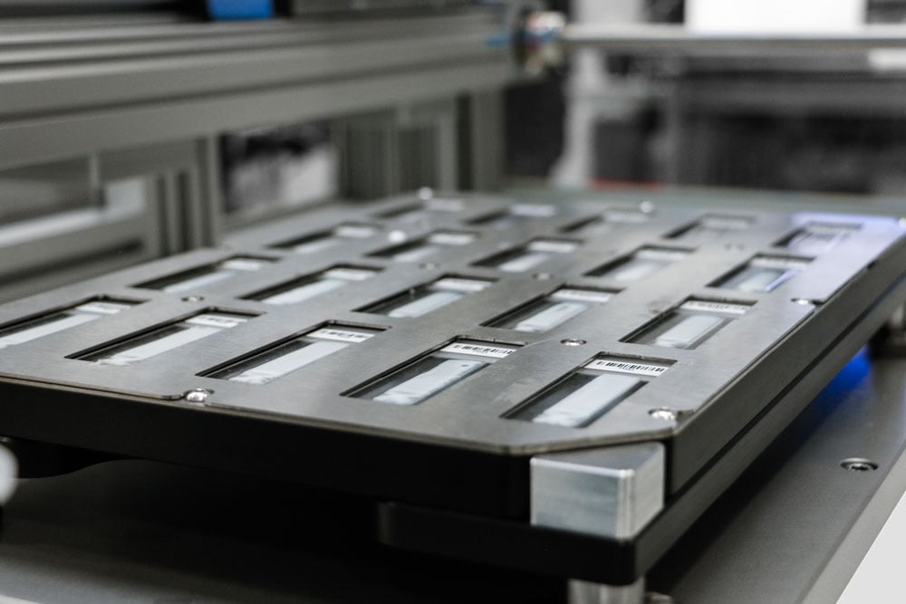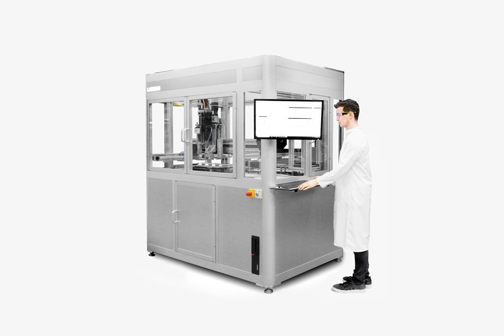 The system dispenses sample from a syringe onto the desired surface or mould, consisting of an XYZ gantry and stacker axis to receive drawn down panels. The process starts with the system picking a syringe, reading the barcode and de-capping it. For slide drawdown, a die is placed on the syringe tip. The system dispenses a measured amount of sample and draws downs using the die onto 20 glass slides secured in a universal slide rack.