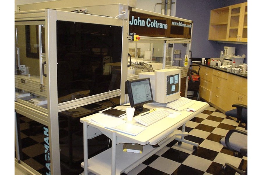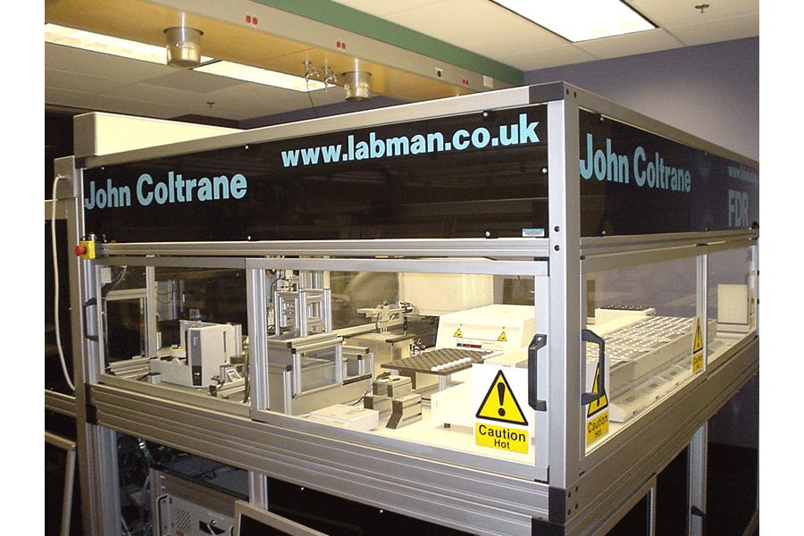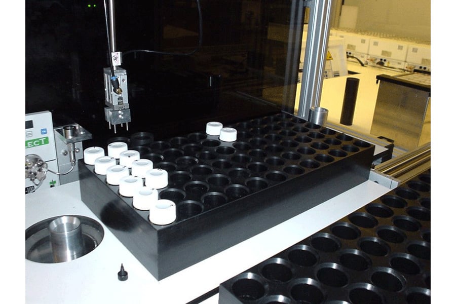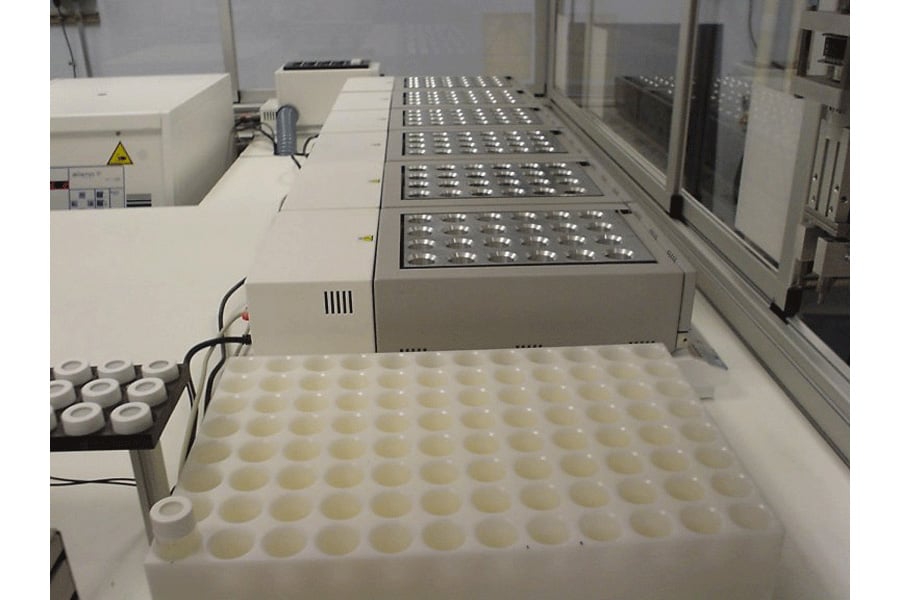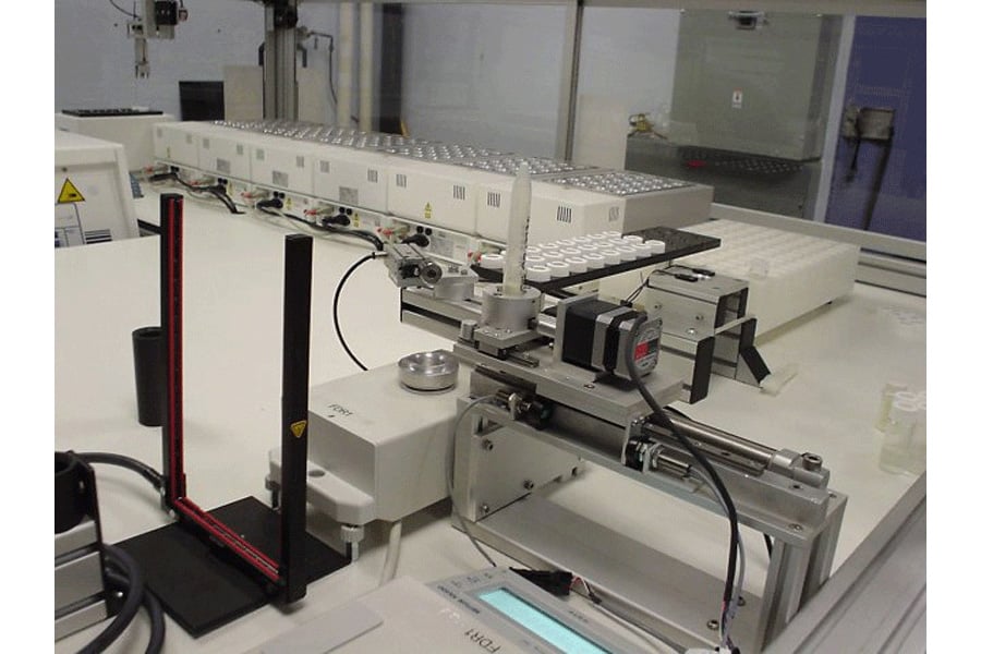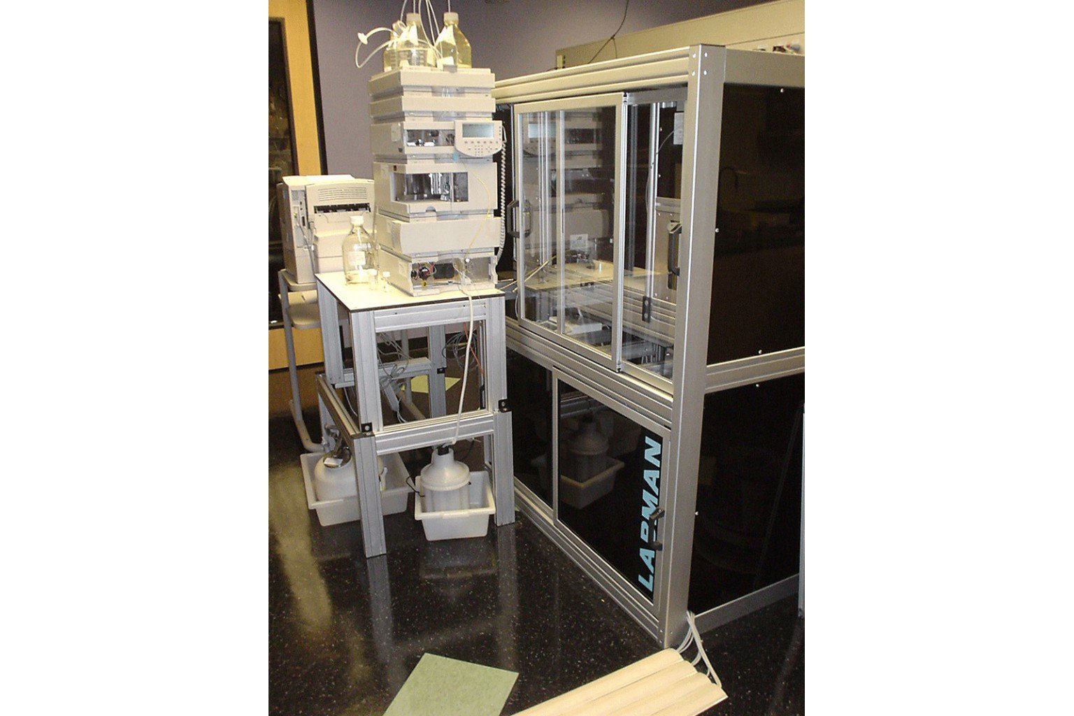 Labman has supplied two Forced Degradation Robots to Pfizer, one at the Sandwich site in the UK and the latest one in La Jolla, San Diego. The later robot was installed in 2001 and was used for preparing samples of candidate drug powders prior to stress testing and analysis. Over a period of three years the robot had various upgrades to further enhance the functionality and increase the level of automation for the degradation process. Samples are heated and shaken in up to six separate heater/shakers each with capacity for 24 vials. The speed and temperature of each is fully configurable. Sample vials can be placed in a chilled store at 4degreesC, in a sun test light box where they are rolled to ensure maximum exposure or stored in other specially designed degradation modules. At defined intervals in the degradation process a sub-sample is taken from each of the sample vials for injection into one of two autosamplers and queued for injection into an HPLC. Standards and blanks are automatically prepared and injected into the HPLC.