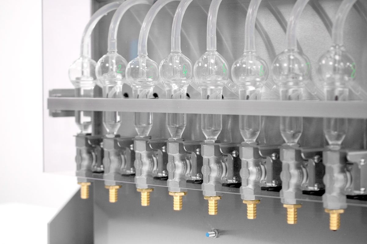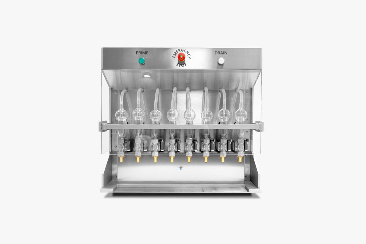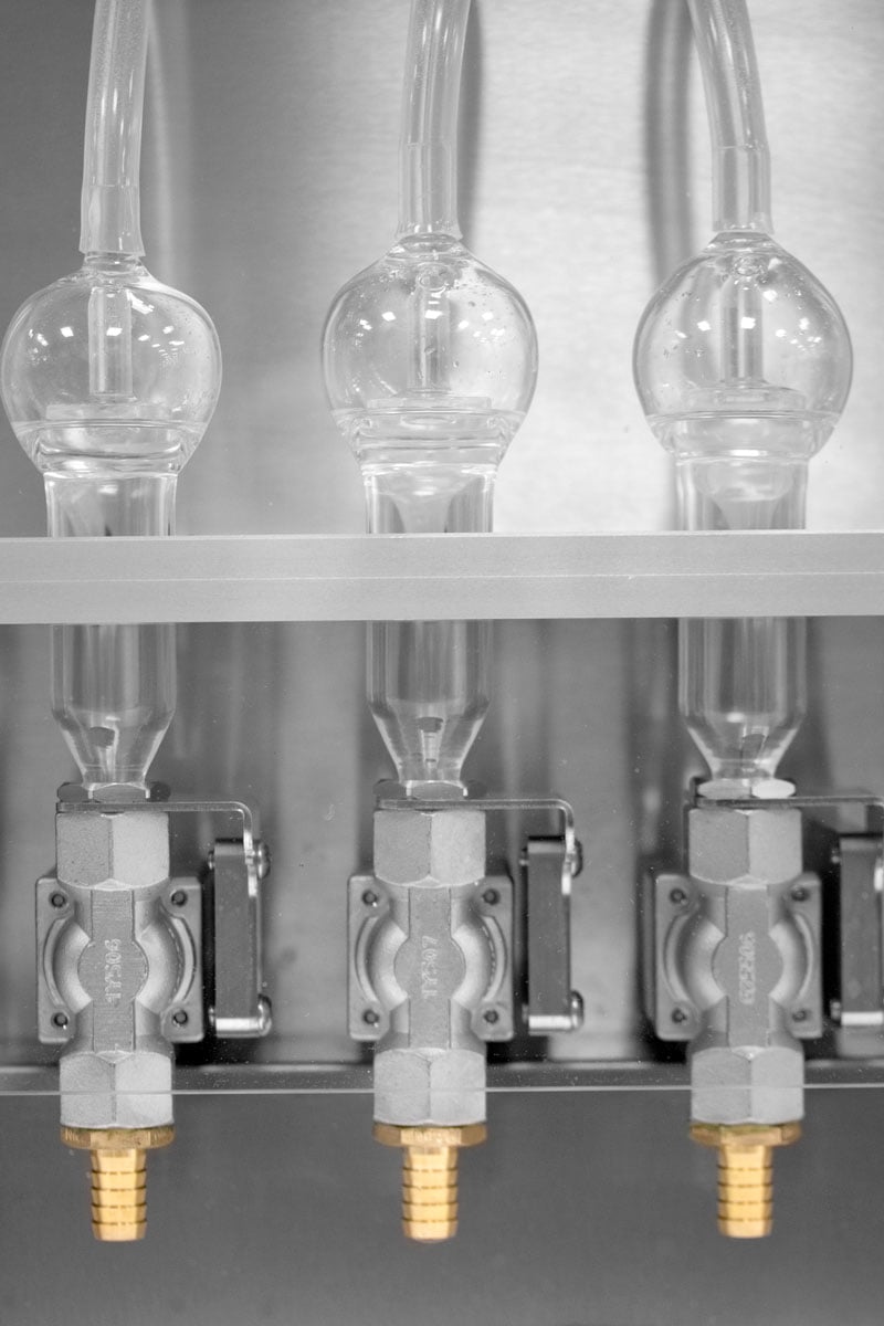 The dispense system uses specialist glass burettes to dispense a measured volumes of reagent into a bottle with a soil sample, 8 samples are processed simultaneously. The dispense system uses a Programmable Logic Controller (PLC) to turn on the pumps to fill the burettes. Once a sensor is triggered the solenoids beneath the burettes open and dispense the liquid into the waiting sample pots. Once the rack of pots is removed the pumps automatically refill the burettes so the operator can fill the next rack. The operators only need to control the system when first priming and when they no longer want the burettes to refill. The system is very robust and is programmed to minimise the possibility of human error; it informs the operator of any required actions via two LEDs. The soil samples which are in the racks used by the dispense system are then filtered into the open pots used by the Liquid Transfer Robot