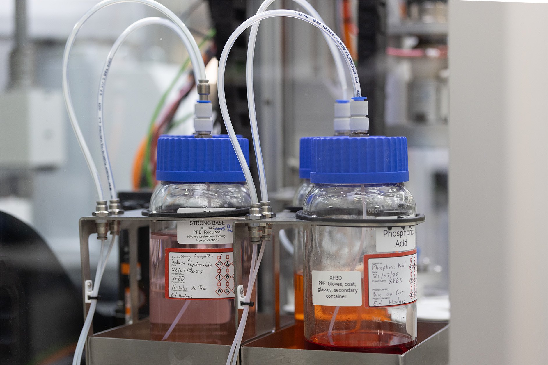 Capping/decapping stationsMultiple bottle cappers ensure the bottles are always sealed to a set torque level when transported, helping to prevent solvent spills and reducing evaporation. Each station subsequently de-caps and recaps the bottles as necessary