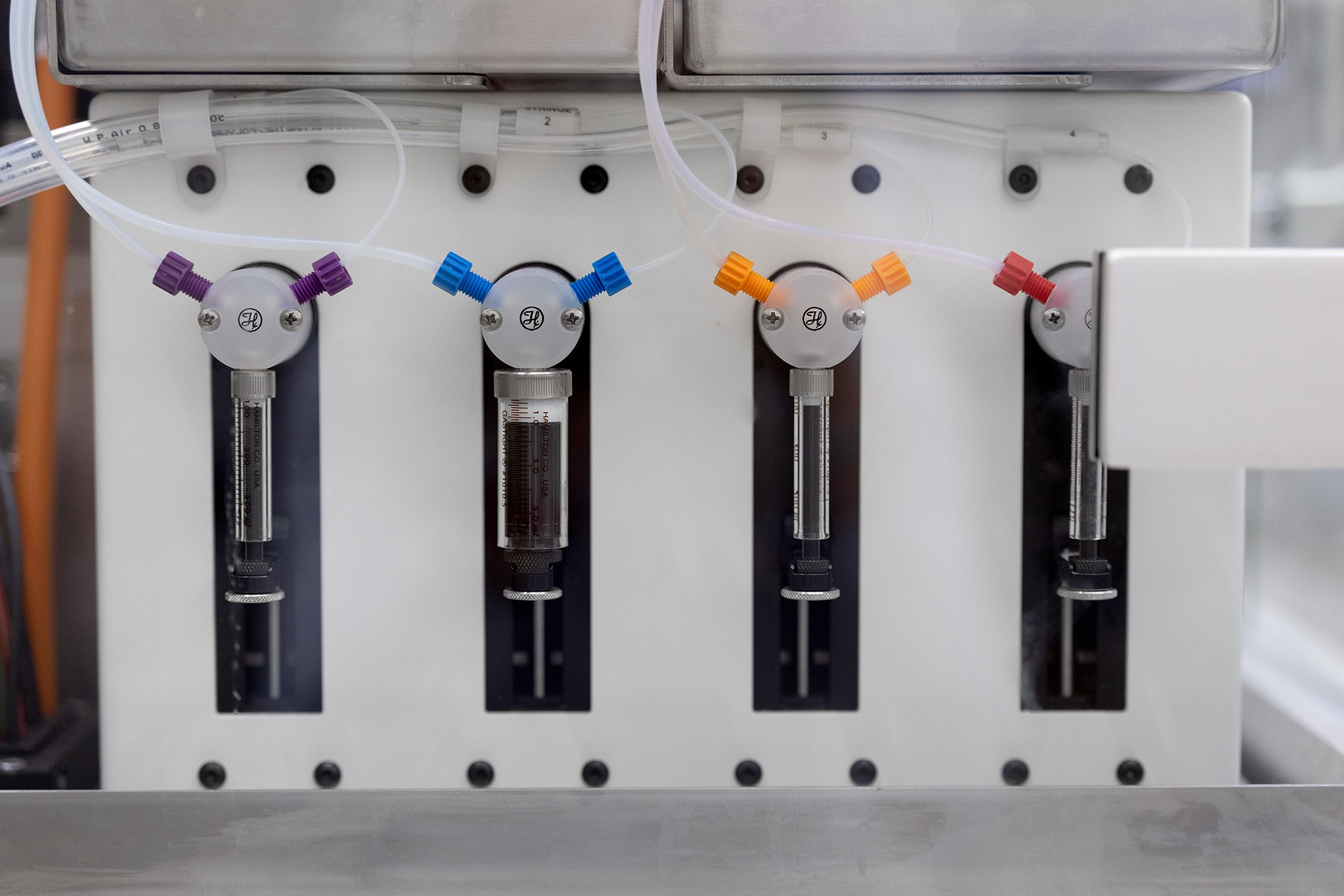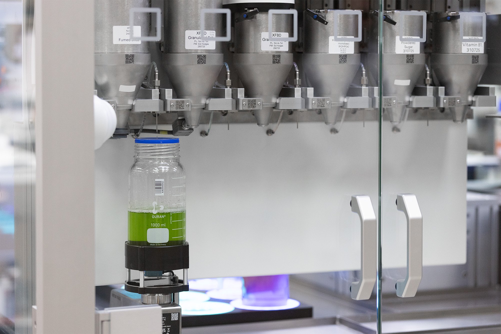 DispensingThe system has twelve powder dispensers, with interchangeable hoppers capable of handling a broad range of powders. Additionally, it has five bulk liquid dispensers for formulations up to 1L and five syringe pumps for finer liquid handling