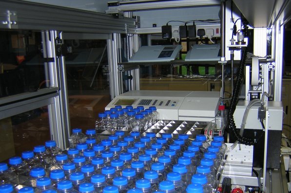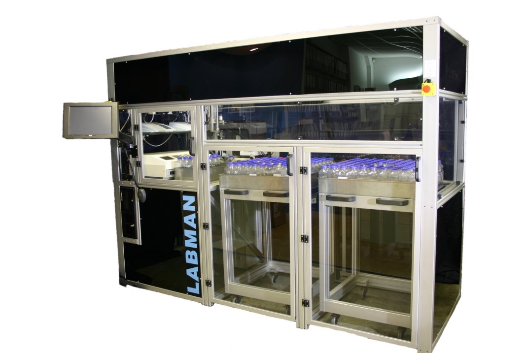 Labman have produced many systems for analysing the physical chemistry of portable and waste water samples. Systems have included any combinations of pH, turbidity, conductivity, colour, UV absorption, carbonates, temperature and dissolved oxygen content. The robots contain functionality to calibrate the instruments and monitor the AQC values for each chemistry. Calibration curves can easily be viewed and printed for your records from the robot software. If AQC values drift then the robot will automatically attempt to recover the chemistry via a rigorous cleaning cycle and recalibration of the affected chemistry. Samples are analysed in low volume flow cells which are thoroughly cleaned between analyses to minimise crossover contamination issues. System dead volume is kept to a minimum through the use of narrow bore tubing, optimised liquid paths and low volume low cells. The colour and UV chemistry includes an inline filtration unit that first pre-filters the water through 5um stainless steel gauze and then through 0.45um filter tape before it passes into the flow cell. This allows the system to analyse samples with a turbidity of 500NTU and higher. Removable trolleys are used to hold the samples. The sample trolleys can be chilled to maintain the sample between 4 to 8 degrees Celsius as an optional extra.
