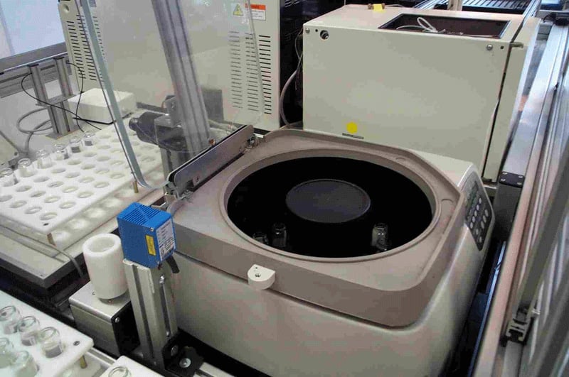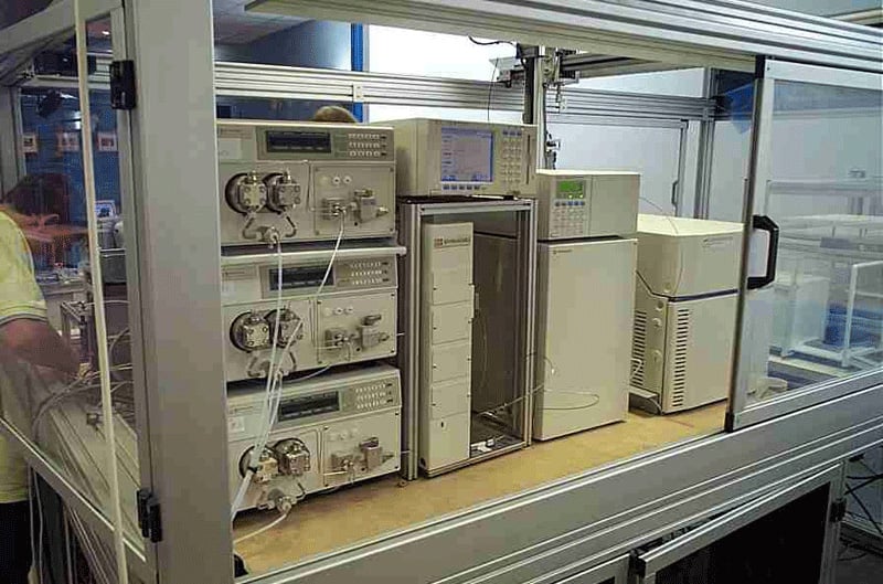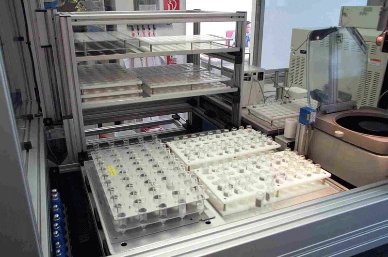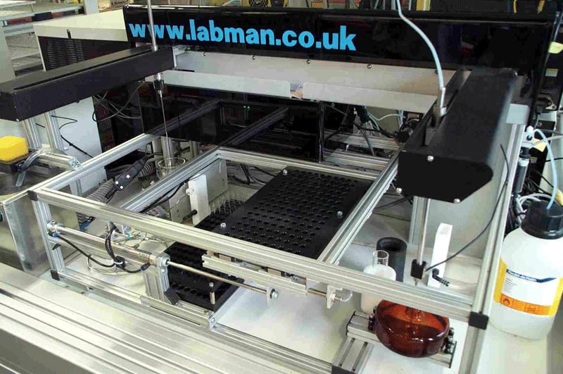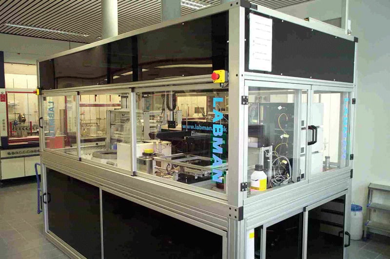 In 2001, Labman installed a fully automated sample preparation and solvent evaporation system for the purification of synthesised chemicals in Frankfurt Germany. Racks of dried-down synthesised samples loaded on to the system are re-suspended and filtered prior to injection on to a Shimadzu HPLC-MS column. Post purification, collection vials are tare weighed and loaded into the fraction collector. Once the fractionated samples are collected they are dried-down and reweighed to determine the product yield.