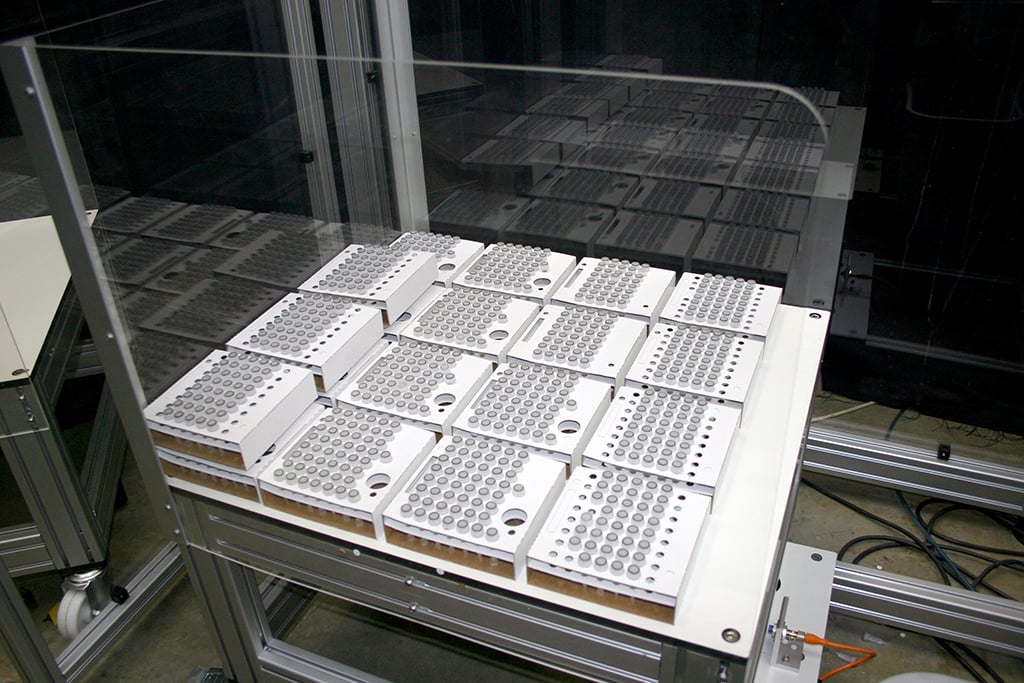 This high throughput system is designed to fill, cap and package around 20000 vials per day and was delivered to a UK based diagnostics company in 2013. The system is designed to work in a clean sterile environment as the vials are used in a medically approved product. Empty vials and caps are loaded in storage hoppers which have enough capacity for 16 hours operation. Empty, flat pack boxes are loaded in stacks. The system fills vials with 0.5ml of âproductâ with better than 1% accuracy, before capping the screw cap vials and loading into the automatically folded boxes. A number of automatic quality checks are built into the system including cap torque measurement of every vial, product stirrer monitoring, and image analysis of completed boxes. Completed boxes are stacked on trolleys to make box unloading fast and efficient.